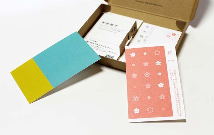 右:日本人に馴染みのある花をモチーフとした「伝統文様」5種と、日本人の美の心である「日本の伝統色」20色を、パーソナルカラータイプ別に100種類の組み合わせから選べる名刺「PERSONAL COLOR MONYO100」。写真の矢吹さんの名刺は、感謝の気持ちという意味を持つ「桜」の文様と、スプリングカラーのひとつ「浅緋(うすあけ)」です。大人の女性にぴったりな和やかな一枚ですね。 →この名刺をつくる