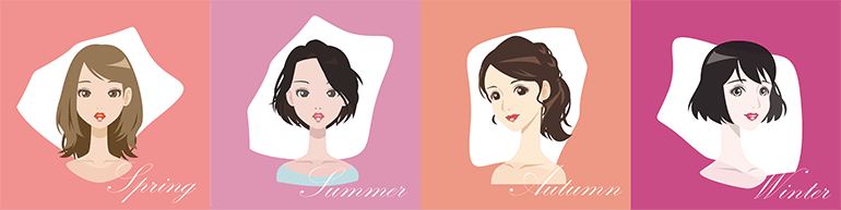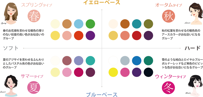 パーソナルカラーのグループは、「Spring~春」「Summer~夏」「Autumn~秋」「Winter~冬」の4つの季節のグループに分けることができ、自分のグループがどこかを探すのが「パーソナルカラー診断」です。