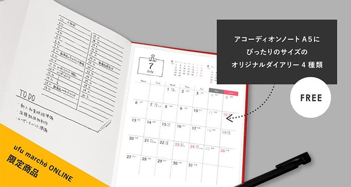 ダウンロードコンテンツ第1弾は、アコーディオンノートA5にぴったりサイズの「オリジナルダイアリー」4種類!なっ、なんとオープン記念で1か月間は無料でダウンロード可能なので、この機会をお見逃しなく!