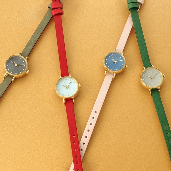 トップに合わせて、時計もコーディネートするといいですね。ブラウンやベージュ系に合わせて朱赤やグリーンのベルトがポイントとなりますね。