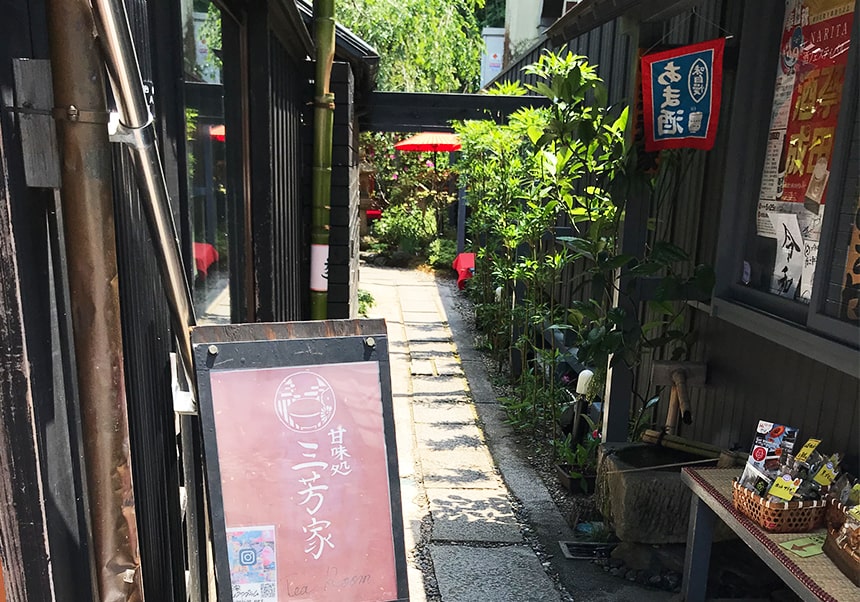 仲町・幸町界隈の参道を散歩中に、素敵な隠れ家的お茶処「三芳家」を発見。ここのお店、新勝寺から成田駅方面に坂を上っているときには気づかなかったのですが、新勝寺方面に帰る際に見つけたお店です。うなぎの名店「川豊本店」の少し手前の細い路地を石畳に沿って進むとお店があります。