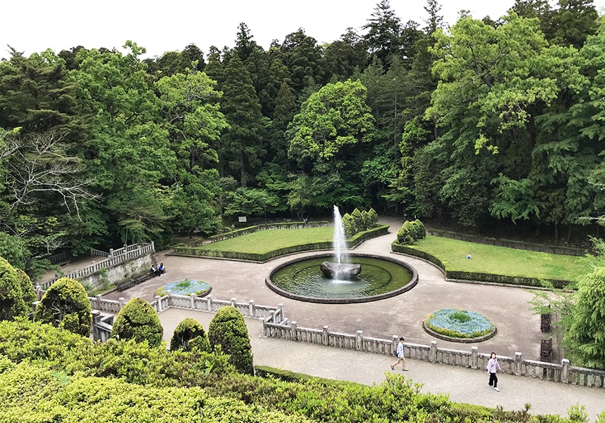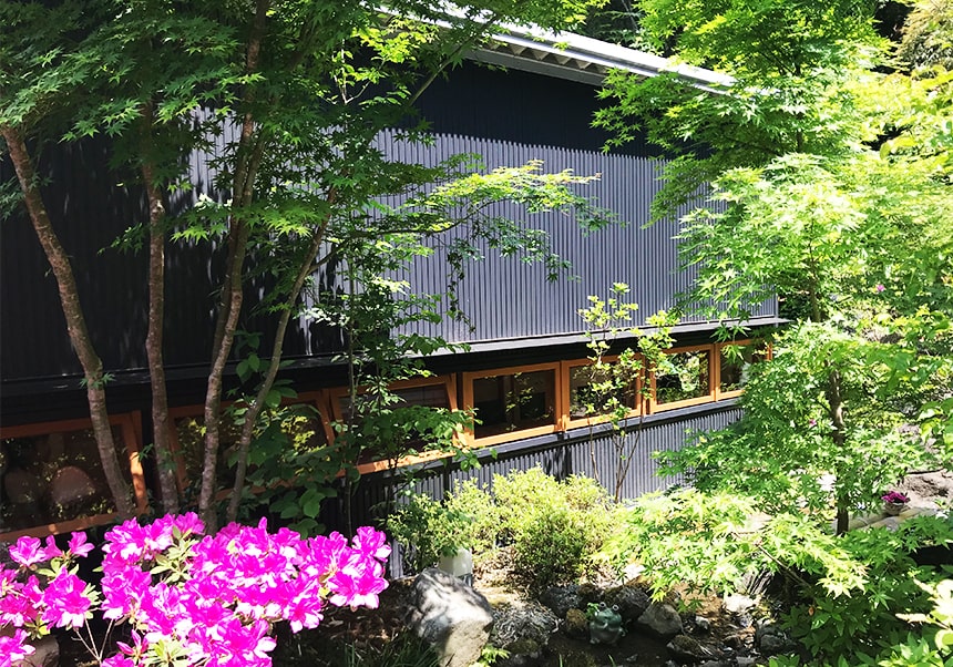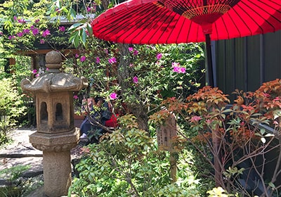 細い路地を抜けると、心落ち着く庭園が広がっています。人通りが多く賑やかな参道のすぐ傍に、こんな和みの空間があるなんて。