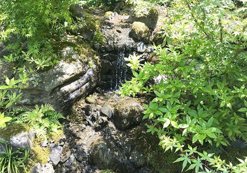 この日は陽射しが強く歩いて暑かったので、あんみつと冷抹茶(お菓子付)を注文しました。待っている間は、奥の竹林や緑の木々を眺めたり、小さな滝から水が流れているので、せせらぎを聴いたりと、のんびりできて癒されます。