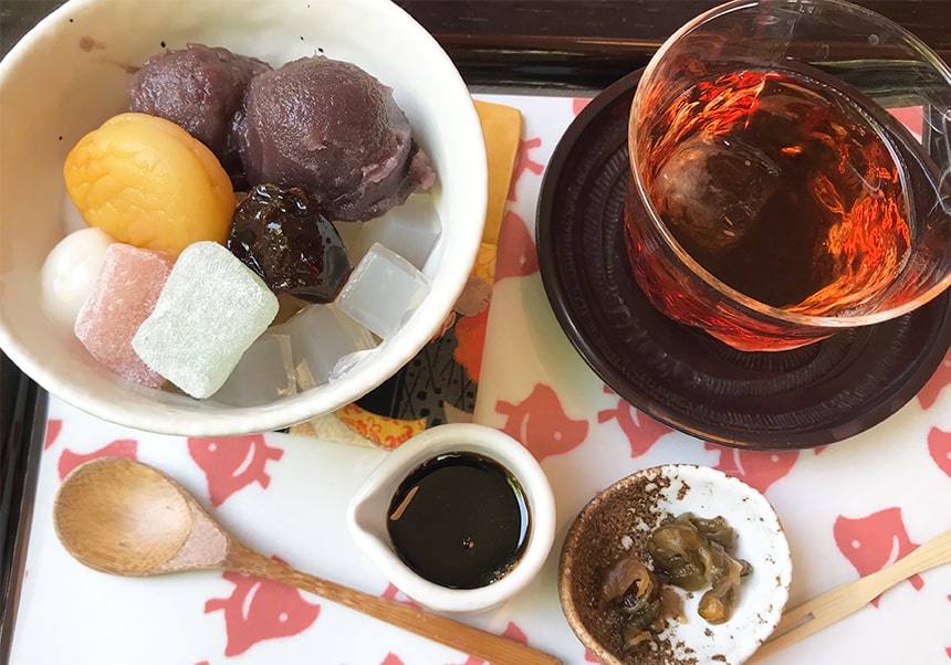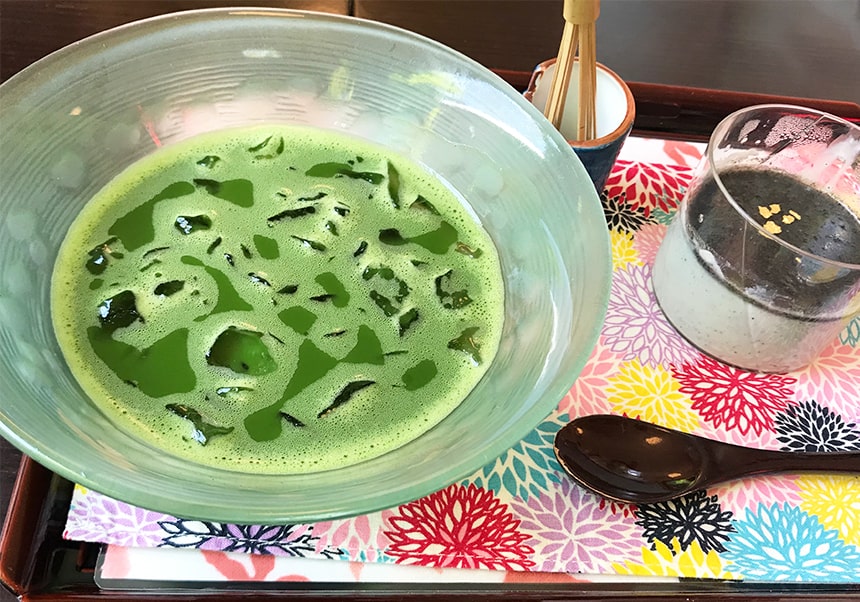 そうしている間にあんみつが到着。疲れた体にやさしいあんこの甘さが染み渡ります。添えられた漬け物をときどき食べれば、甘味をさらに感じられます。続いて冷抹茶。下に抹茶が沈んでいるのでよくかき混ぜてからいただきます。ほどよい抹茶の苦みが口の中をサッパリとしてくれます。ちなみにこの時のお菓子は黒ゴマプリンで、こちらも美味でした。