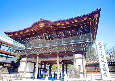 成田山新勝寺を訪れて最初に目にするのが「総門」です。こちらの門は総欅造りで高さは15m、楼上に8体の生まれ歳守り本尊が奉安されています。総門をくぐり進むと、続いて階段を上った先に「仁王門」があります。左右には江戸時代に建立されて以来、成田山の門を守ってきた歴史ある仁王像があります。