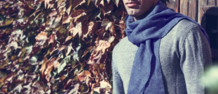 サマータイプの方に似合うマフラーは優しいブルーや紺のオーソドックスなタイプです。