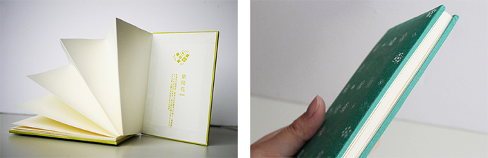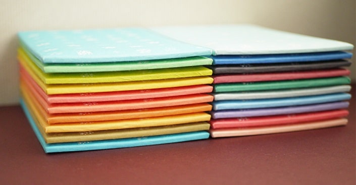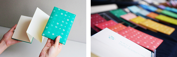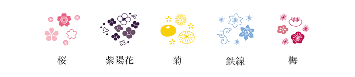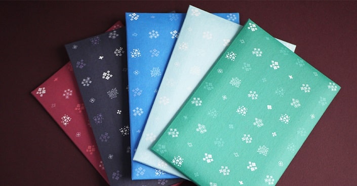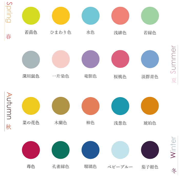 日本人になじみの深い、桜、紫陽花、菊、鉄線、梅の5種類の花文様。そして、四季折々の自然の変化に富む日本が、四季のうつろいの中に美を見い出し、生まれた日本の伝統色の中からから20色を選び、パーソナルカラーアナリストが4つの季節のタイプに色分け。それぞれを掛け合わせて100通りの組み合わせから表紙が選べます。
