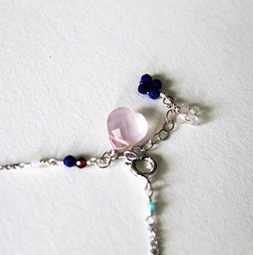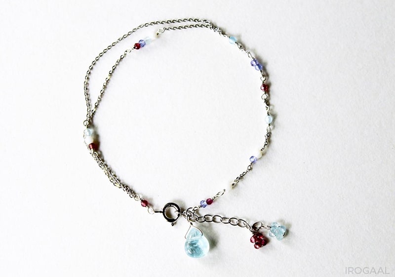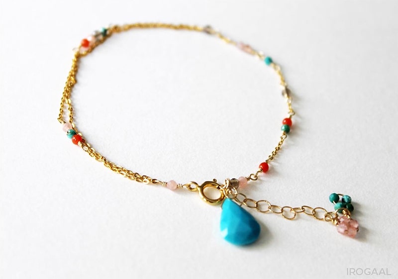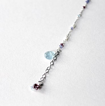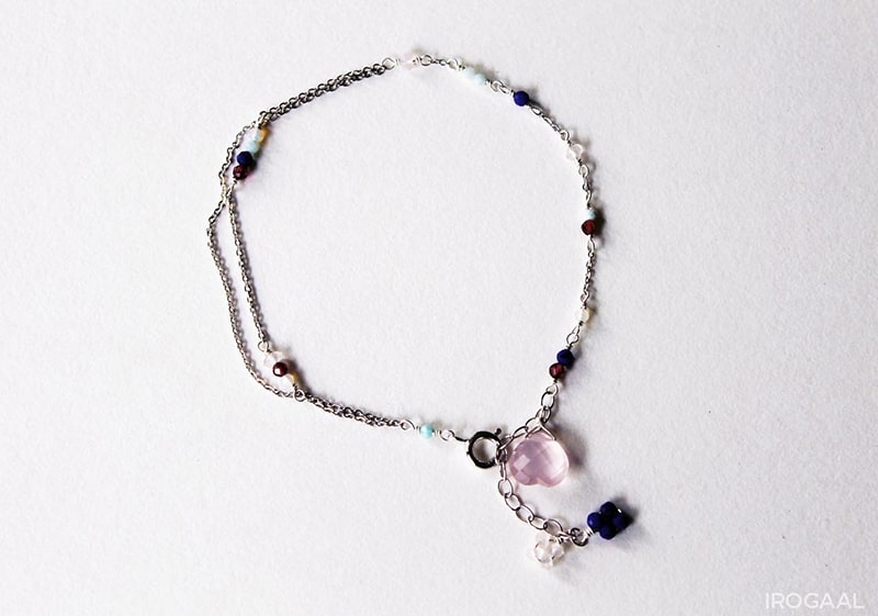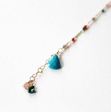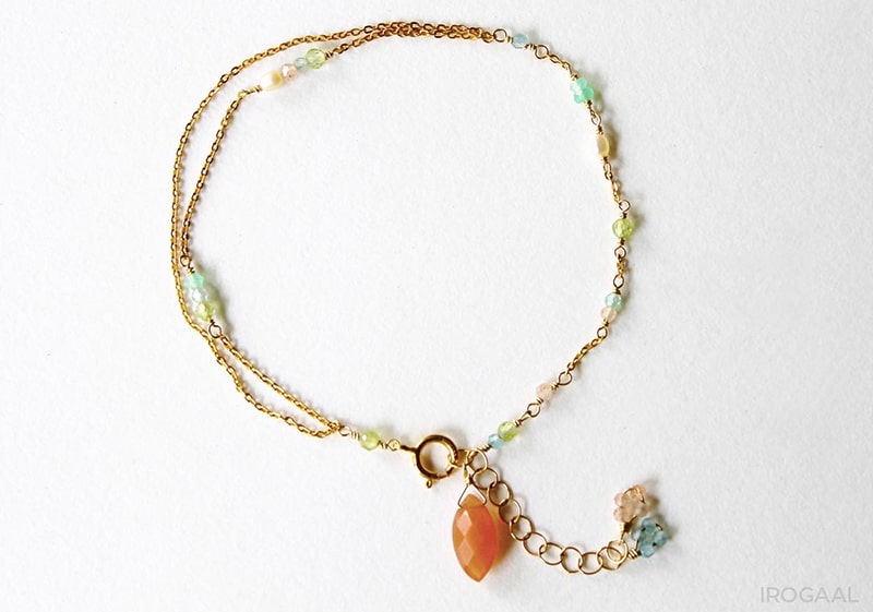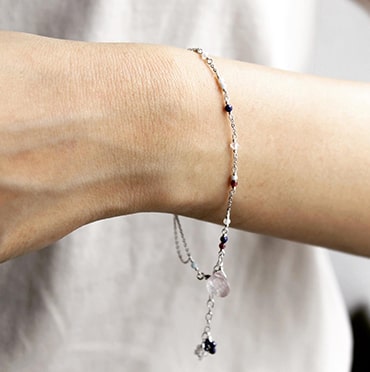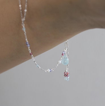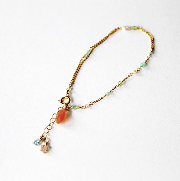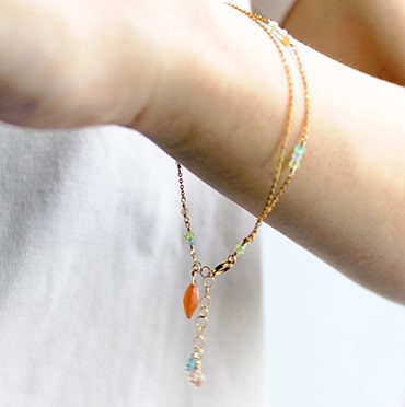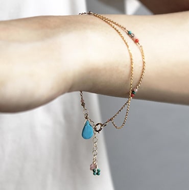 ブレスレットは小粒のパワーストーンがあしらわれた華奢なデザインが特徴。パーソナルカラータイプ別にセレクトされたストーンが、身につける人の魅力を引き出します。チェーンが二連になっており、揺れ動くたびに真夏の陽射しを反射してさりげなく輝きます。
