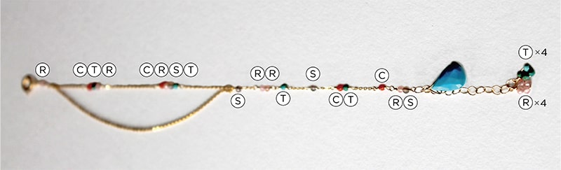 R:ロードクロサイト C:サンゴ(コーラル) T:トルコ石 S:スモーキークオーツ