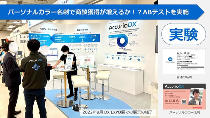 そしてまずは、コニカミノルタが出展する展示会でパーソナルカラー名刺を使い、商談獲得が多くなるかどうか、実際のビジネスの場を活用したABテストを実施することが決まった。この実証実験は、パーソナルカラーの活用場面を具体的にし、顧客像や提供価値を洗練することで、パーソナルカラーがどこまでビジネス成長に寄与できるかを確かめる新たな取り組みとなった。