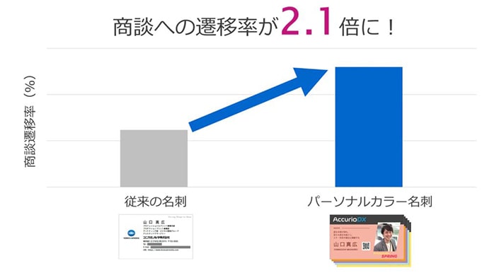 なんと普通の名刺を渡すよりも、パーソナルカラー名刺を渡したほうがその後の商談に2.1倍も遷移しやすいという結果が得られたのだ。第一印象で決まりやすい展示会の場面で、N1分析※とはいえこのような検証結果が出たことは、ビジネスの成果のためにパーソナルカラー名刺を使うことが何かしら効果があるということの確証につながった。