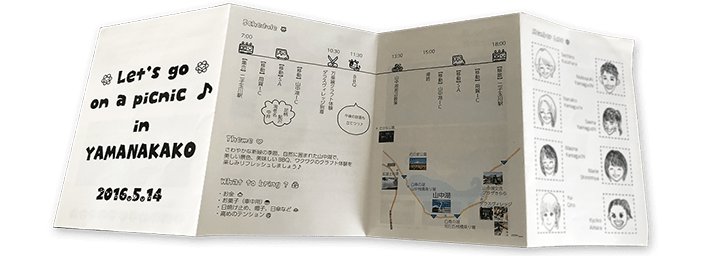 第3回(2016年5月14日)の行き先は... 万華鏡づくりとバーベキューをしようということになり、「山中湖」へ!WATASHINOスタッフに加え、私の家族も参加することになり賑やかな旅に。今回も女性スタッフが手作りの旅のしおりを制作。だんだん本格的な遠足になってきました(笑)