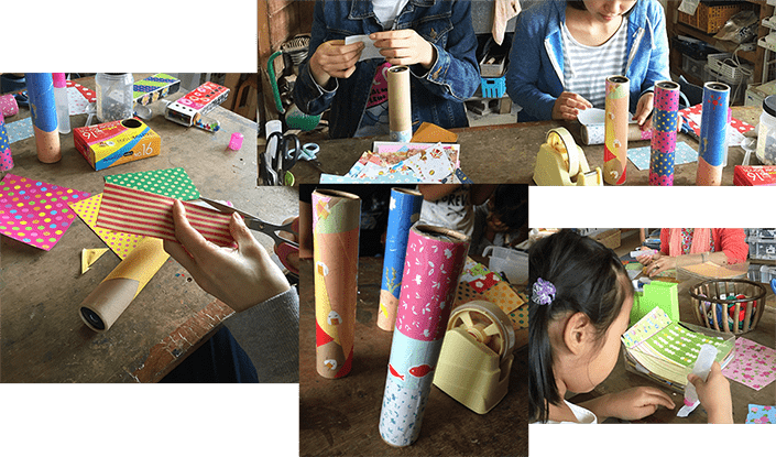 子供たちも楽しめる万華鏡づくり。「筒型」万華鏡と「水」万華鏡の2種類の体験コースがありますが、今回は「筒型」万華鏡を選びました。自分好みの色のガラス玉を筒に入れて、組み立て、お気に入りの色紙で装飾して自分だけのオリジナルの万華鏡が完成! 今回の遠足のお土産にもなりました。