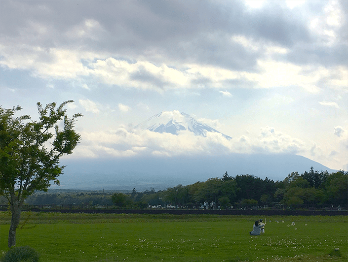 遠足当日の天気は、いつものごとく自称「晴れ女」と自称「雨女」という女性スタッフを足して2で割ったような曇り空...。道が混むことを想定して集合は早めのAM7:00 二子玉川駅。しかし思いのほか道は順調で、予定時間よりも早く山中湖へ到着。