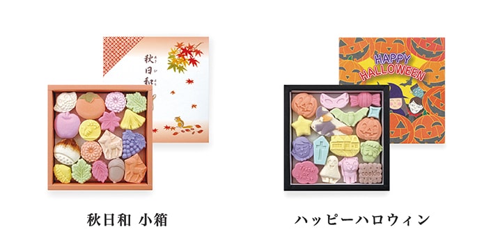 ちなみに今の時期(秋)は、栗や柿、どんぐりや紅葉した葉っぱなど、秋色に染まった美しい風景をお干菓子で表現した「秋日和」や、ハロウィンでおなじみのかぼちゃおばけや魔女、ドラキュラやフランケンをお干菓子にした「ハッピーハロウィン」が出ています。どちらも可愛らしくて食べるのがもったいないくらいですが(笑)