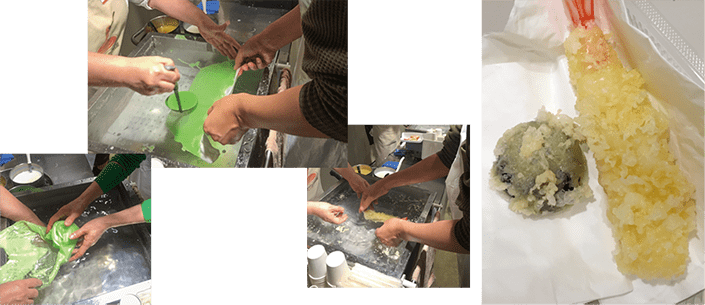 事前に申し込みしたのは天ぷら2品とレタス1つを製作する天ぷら&レタスのコース。製作のまえに天ぷらの具材をチョイス。エビともう1品好きなものを選びました。