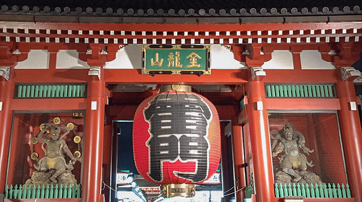 食品サンプルづくりを楽しみ、話をしながら歩くこと10分。到着したのは浅草寺の雷門。日が暮れたにもかかわらず、観光客でにぎわっていました。