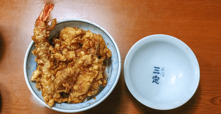 浅草寺でお参りをし、仲見世通りを楽しんだところで、女性スタッフのすすめで夕食は「三定」へ。小かき揚げ、海老、白身魚がのった上天丼を注文。どんぶりから飛び出るほど大ぶりの天ぷらにたれが絡んで絶品です。