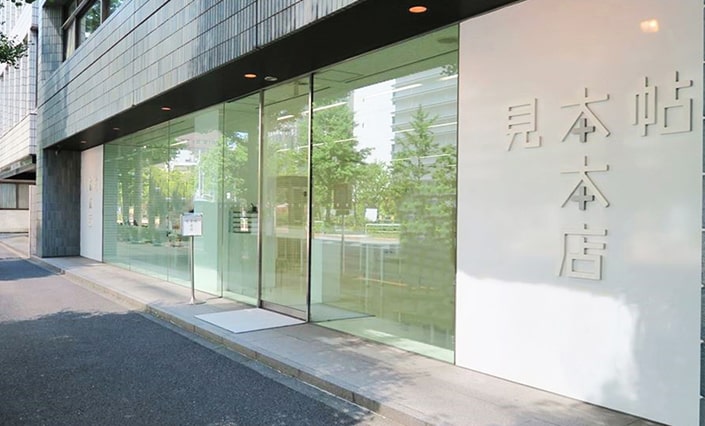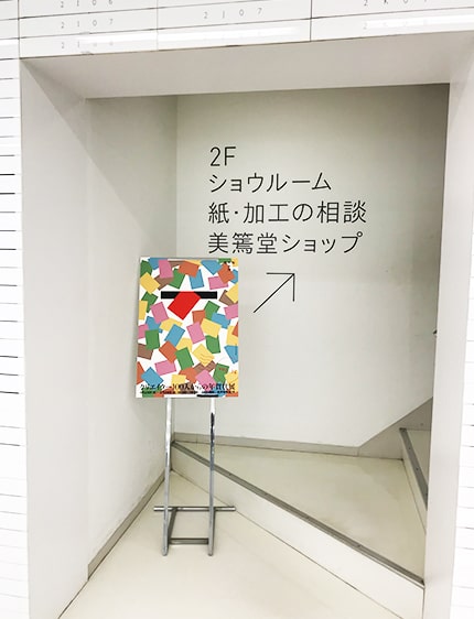 見本帖本店の年賀状展は、2階のショウルームで開催されています。奥の階段を使って2階に上がります。ちなみに1階のショップには、約300銘柄 2,700商品の紙の見本が色ごとにグラデーション状にきれいに並べられており、実際に手に取って見ることができます。